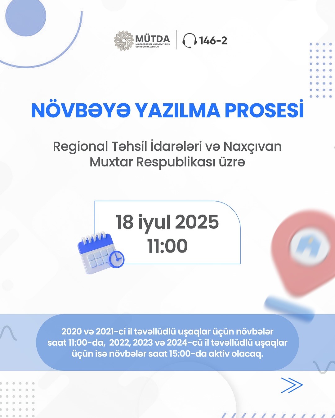 18 iyul 2025-ci il saat 11:00-dan etibarən Regional Təhsil İdarələri və Naxçıvan Muxtar Respublikasının tabeliyində olan məktəbəqədər təhsil müəssisələrinə, 25 iyul 2025-ci il saat 11:00-dan etibarən isə Bakı şəhəri üzrə məktəbəqədər təhsil müəssisələrinə qəbul üçün valideynlər elektron qaydada növbə yarada biləcəklər. 2020 və 2021-ci il təvəllüdlü uşaqlar üçün növbələr saat 11:00-da, 2022, 2023 və 2024-cü il təvəllüdlü uşaqlar üçün isə növbələr saat 15:00-da aktiv olacaq.