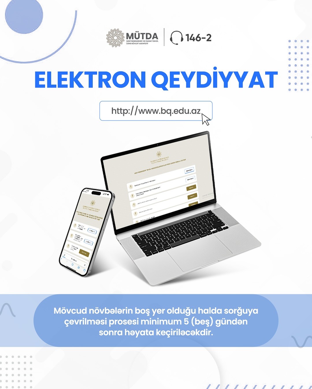 18 iyul 2025-ci il saat 11:00-dan etibarən Regional Təhsil İdarələri və Naxçıvan Muxtar Respublikasının tabeliyində olan məktəbəqədər təhsil müəssisələrinə, 25 iyul 2025-ci il saat 11:00-dan etibarən isə Bakı şəhəri üzrə məktəbəqədər təhsil müəssisələrinə qəbul üçün valideynlər elektron qaydada növbə yarada biləcəklər. 2020 və 2021-ci il təvəllüdlü uşaqlar üçün növbələr saat 11:00-da, 2022, 2023 və 2024-cü il təvəllüdlü uşaqlar üçün isə növbələr saat 15:00-da aktiv olacaq.